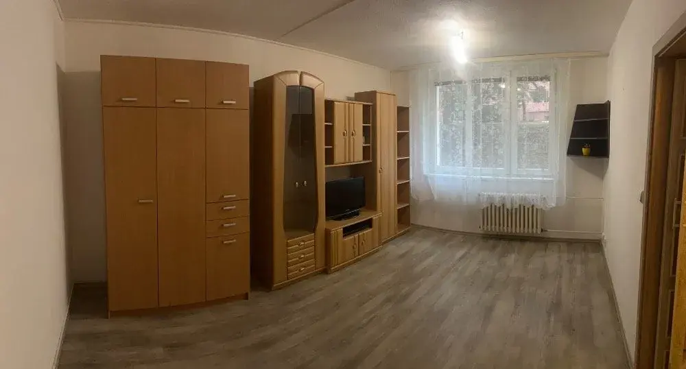 Obývací pokoj je prostorný a světlý, nabízí dostatek úložného prostoru včetně obývací stěny. Koupelna je zděná, vybavená sprchovým koutem, umyvadlem, toaletou a pračkou. V bytě se nachází také praktická vstupní chodba s úložným prostorem.