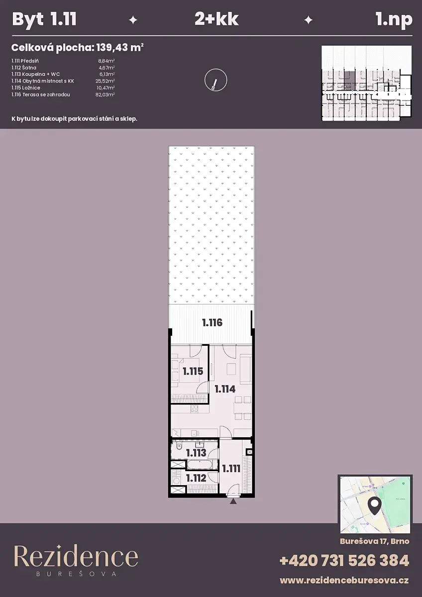Nabízíme k prodeji moderní byt 2+kk o podlahové ploše 58,00 m2 s terasou 82,90 m2 nacházející se v námi připravovaném projektu Rezidence Burešova v atraktivní lokalitě Veveří. Byt se nachází v 1.NP, orientace bytu do vnitrobloku.