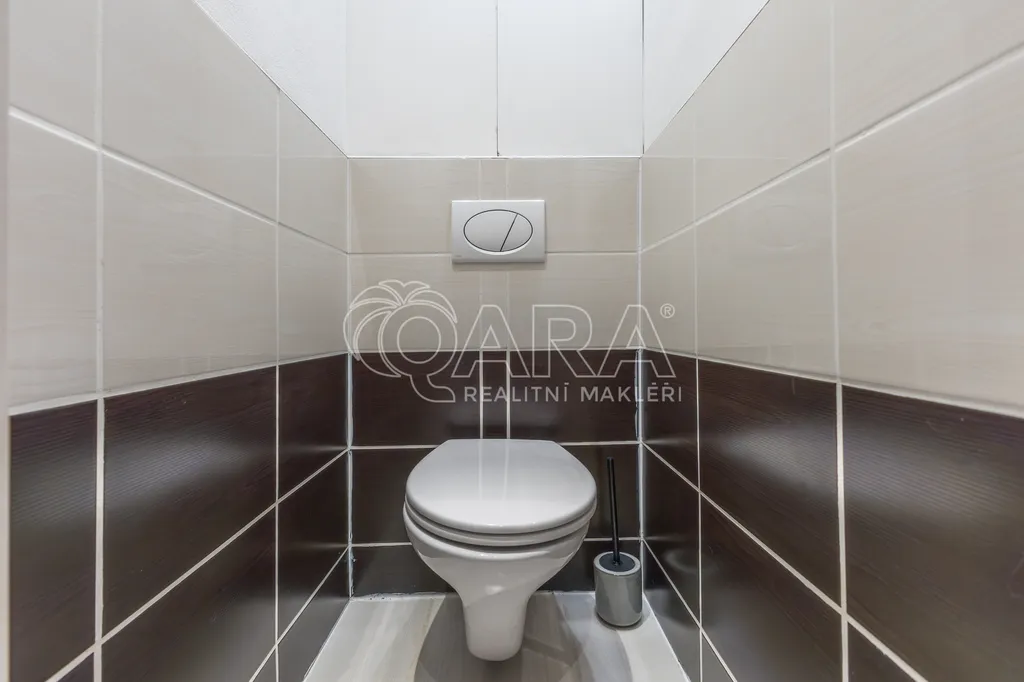 Koupelna disponuje vanou, umyvadlem se skříňkou a topným žebříkem. WC je oddělené, přičemž koupelna i toaleta jsou řešeny v jednotném designu s keramickým obkladem a dlažbou.