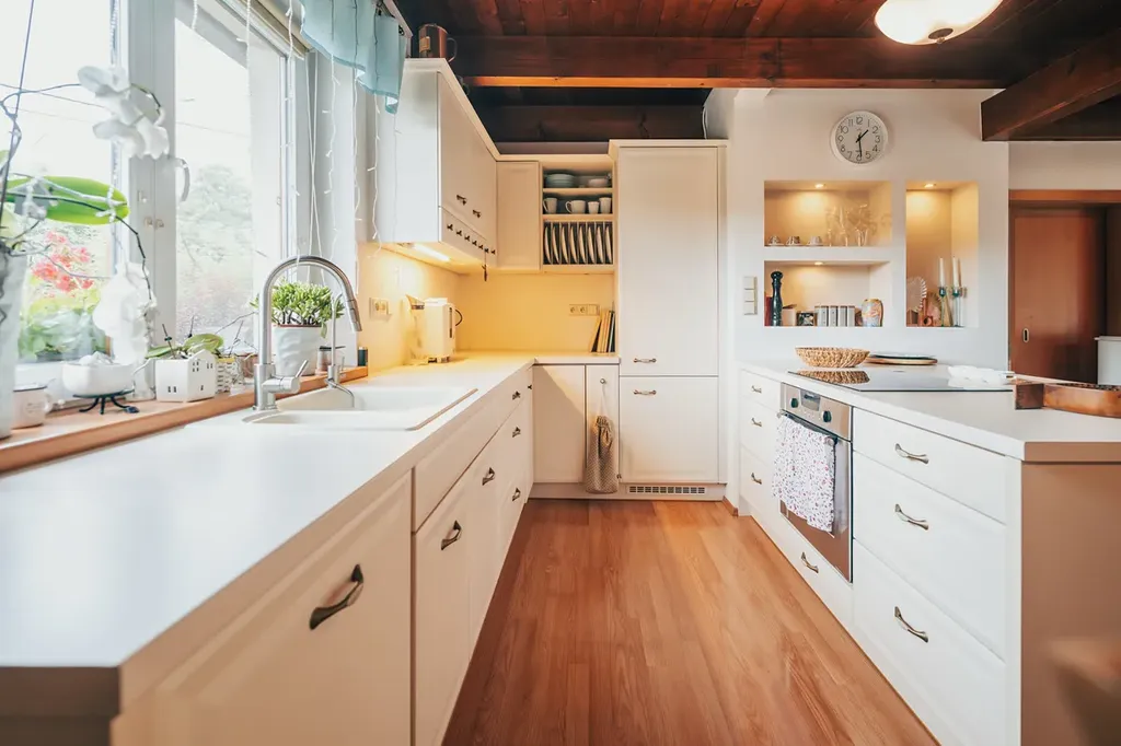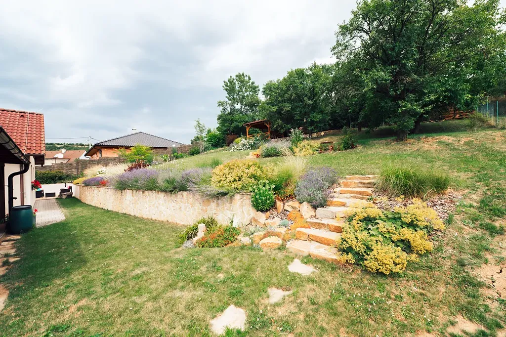 Pečlivě udržovaná zahrada s kvetoucími záhony, ovocnými stromy, keři a vyvýšenými záhony poskytuje naprostý klid a soukromí. Vše je navrženo s důrazem na funkčnost a estetiku.
