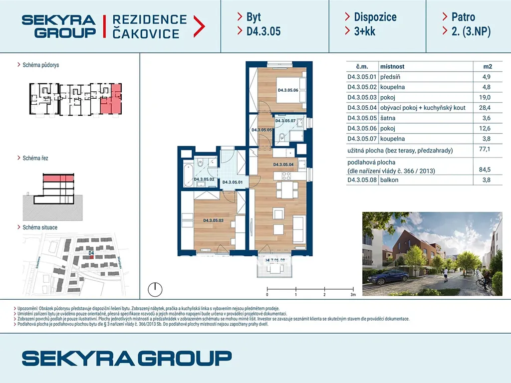 Dovolujeme si Vám nabídnout k prodeji byt 3+kk o výměře 84,5 m² s balkónem 3,8 m² v rezidenčním projektu Rezidence Čakovice.