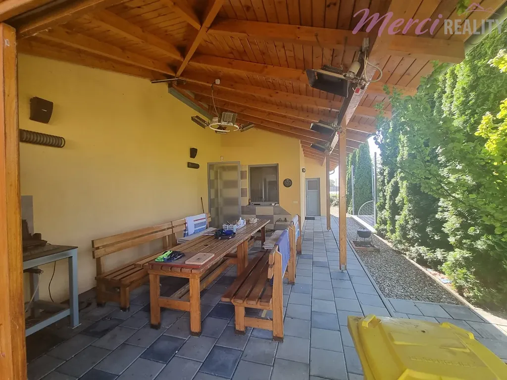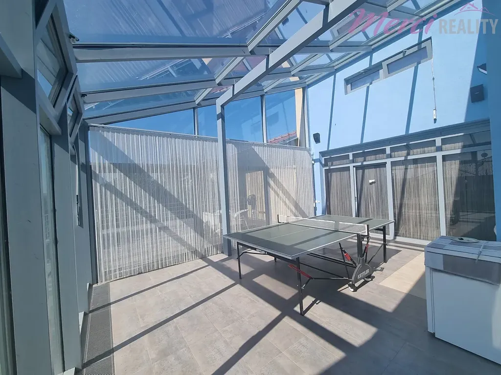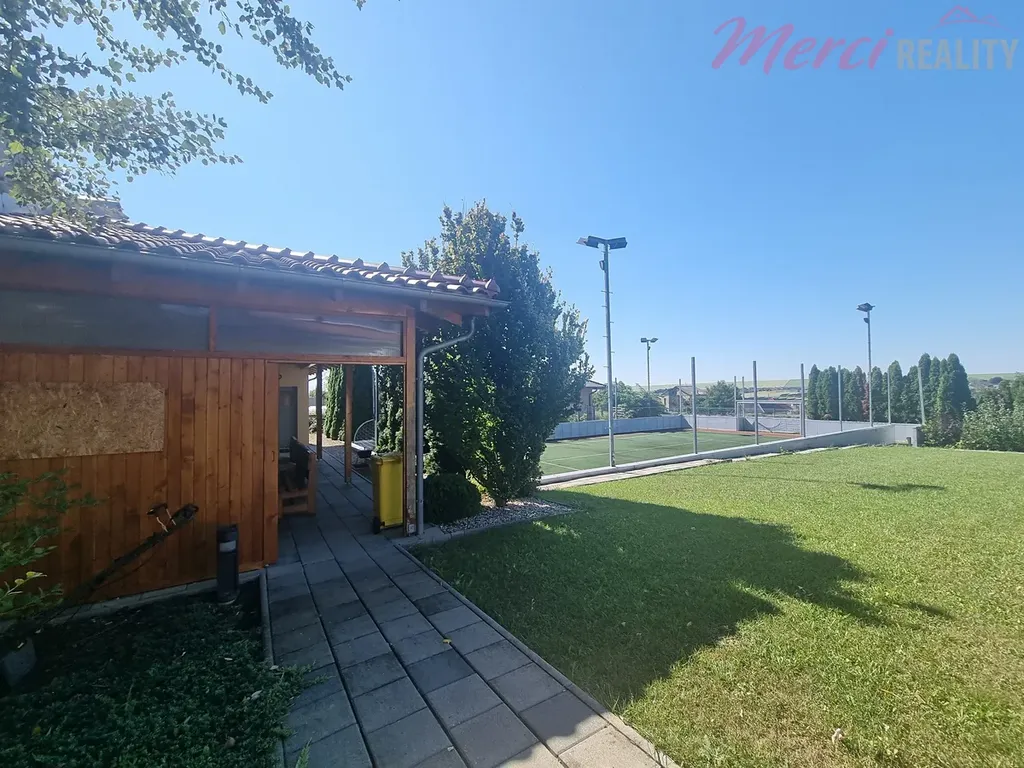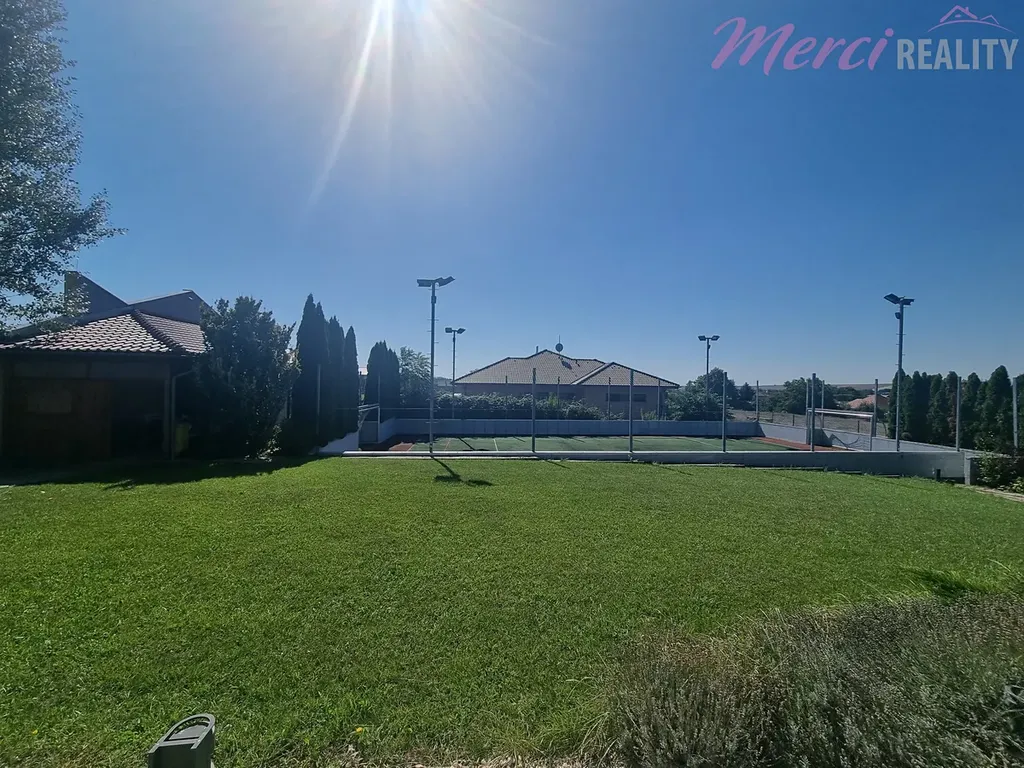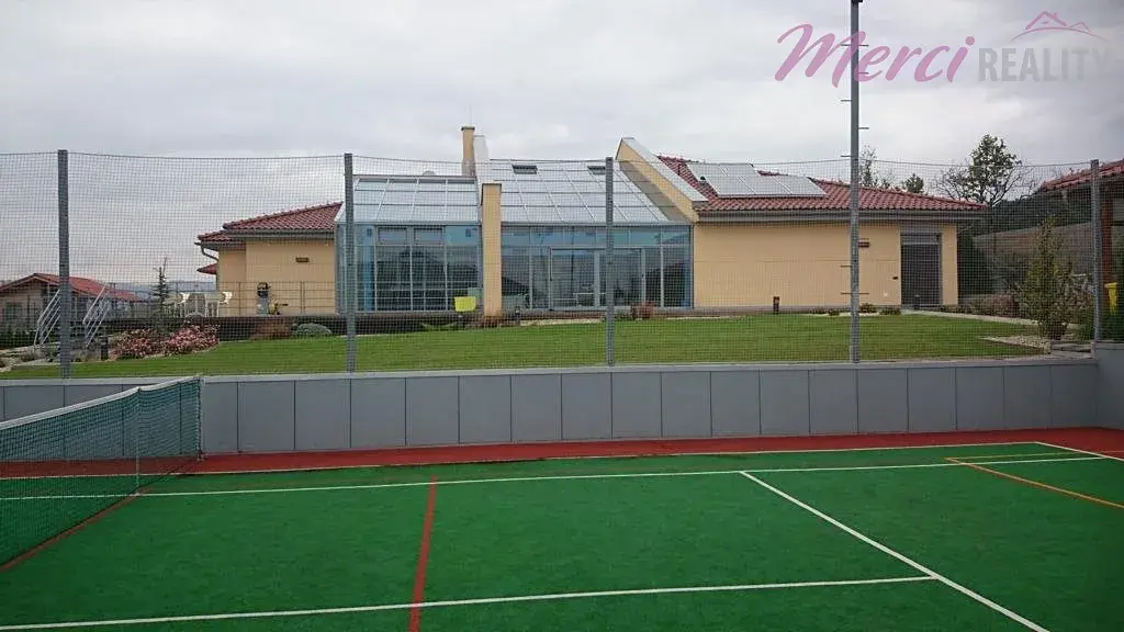 Nabízíme Vám k prodeji rodinný dům 5+1 typu bungalov o užitkové ploše 436 m2. Pozemek o celkové ploše 2144 m2 je kompletně oplocený. Při výstavbě byly použity nejkvalitnější stavební materiály a nejpokrokovější technologie dostupné na zahraničním trhu. Je zde také centrální vysavač, audio-video síť po celém areálu i spolu s WIFI sítí. Dále kamerový systém s pěti barevnými digitálními kamerami, uzamykací systém QUARD, klimatizace, vzduchotechnika, podlahové vytápění. Srážková a splašková voda po úpravě v biolog. čističce je všechna využita pro závlahu okrasné a ovocné zahrady. Na izolaci byl použit nejkvalitnější nehořlavý STYRODUR. V domě se nachází 5 pokojů, technická místnost, zimní zahrada, bazén, sauna, garáž a terasa. Na pozemku se nachází zahradní dům, který slouží jako zázemí pro sportoviště. Je zde venkovní posezení, kuchyňka, sociální zařízení a na terase je sezení pro 12 osob a diskrétní sprcha s teplou vodou. Součástí je také sklep pro skladování vína, ovoce a zeleniny. Nachází se zde multifunkční hřiště určené k provozování sportů jako tenis, fotbal, bedminton a nohejbal. Hřiště má umělý koberec o výšce 10 mm a je odkanalizované. Celé hřiště je ozvučené a osvětlené.