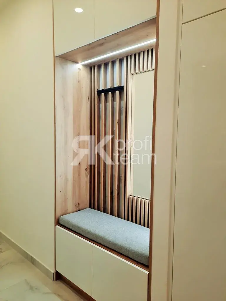 V předsíni: vestavná šatní skříň + botník s odkládací lavicí a zrcadlem.