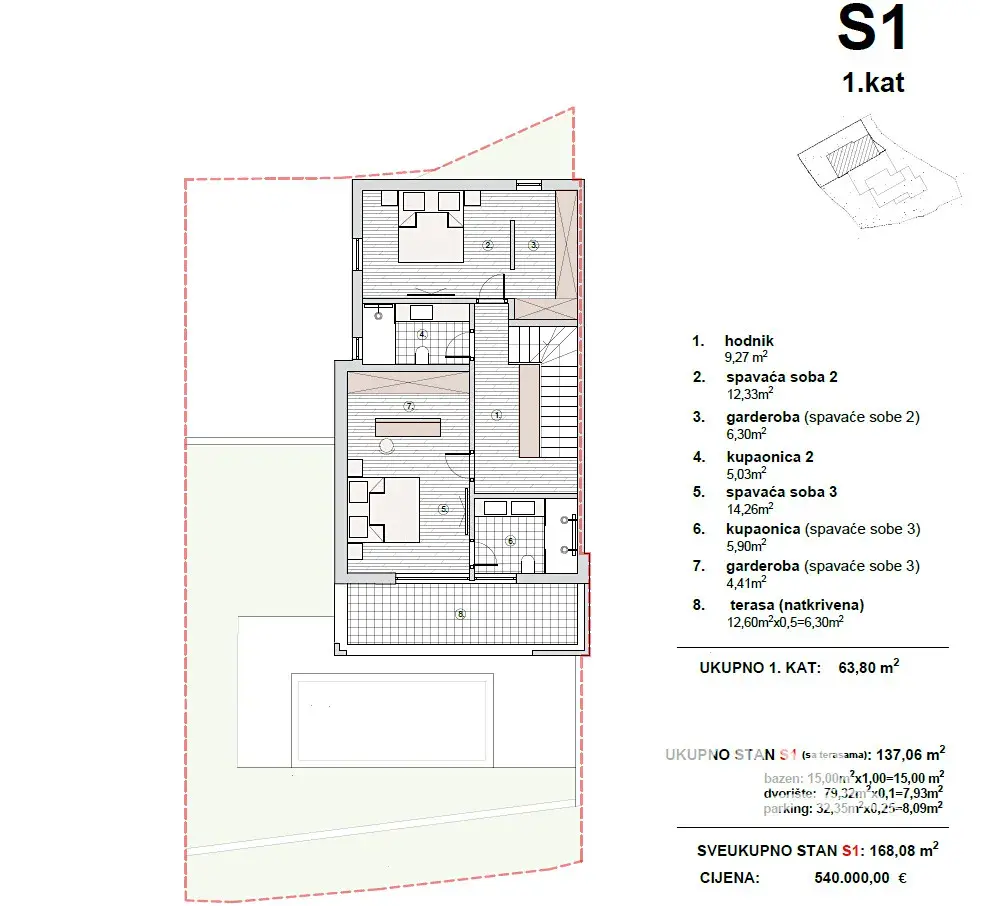 Vila S1 má celkovou čistou užitnou plochu 168,08 m² a zahrnuje obytnou část 137,06 m², bazén 15 m², dvůr 79,32 m² a parkovací plochu 32,35 m². Dispozice je řešena do dvou podlaží. Přízemí nabízí vstup, ložnici, koupelnu a otevřený obývací prostor s kuchyní a jídelnou se vstupem na krytou terasu a k vyhřívanému bazénu. V patře se nachází hlavní ložnice s vlastní koupelnou, šatnou a krytou terasou, další ložnice a koupelna. Cena činí 675 000 eur.