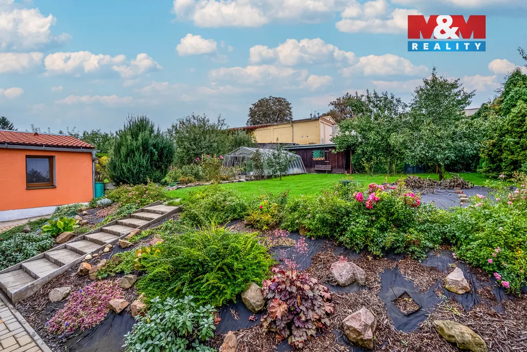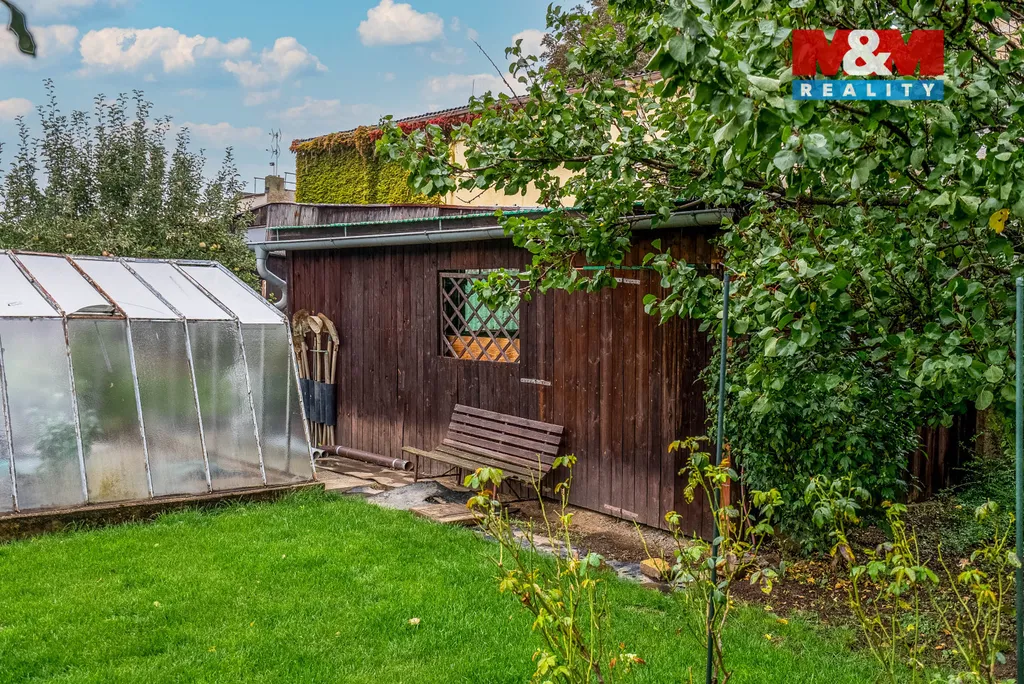 K domu náleží prostorná zahrada o velikosti 540 m² s vlastní studnou a zahradním domkem s kompletními inženýrskými sítěmi, ideální pro relaxaci či vybudování bazénu.