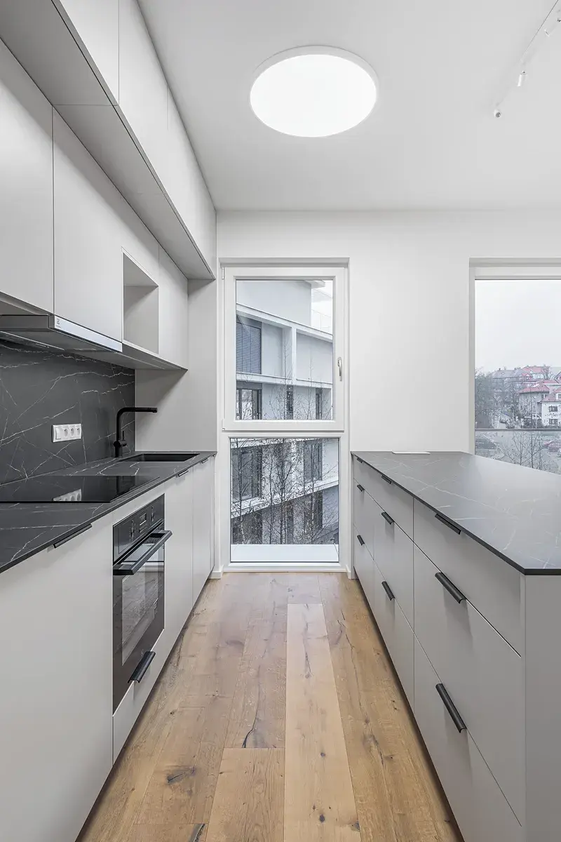 Nabízíme k pronájmu částečně zařízený moderní byt s dispozicí 2+kk o celkové podlahové ploše s balkonem 51,1 m². Nachází se v 4. nadzemním podlaží nového rezidenčního komplexu Hagibor na rozhraní Strašnic, Žižkova a Vinohrad, v těsné blízkosti stanice metra Želivského. Interiér tvoří vstupní hala, prostorný obývací pokoj vybavený kuchyňskou linkou s přístupem na severozápadně orientovaný balkon, ložnice situované na západ, dále koupelna vybavená sprchovým koutem a umyvadlem. K bytu náleží za příplatek 3.000 Kč/měsíc garážové stání a sklep. Poplatky za společné služby a energie činí 6.000 Kč, elektřina se převádí na nájemce. Dále se hradí kauce ve výši dvou měsíčních nájmů a provize realitní kanceláře. Standardy jsou charakteristické vysokou kvalitou použitých materiálů s důrazem na funkční design. Zahrnují vestavěné skříně, dřevěné třívrstvé podlahy v dubovém odstínu, bezpečnostní protipožární vstupní dveře s ocelovou zárubní, bílé falcové interiérové dveře, plastová okna, keramickou koupelnovou dlažbu a obklady, bílou koupelnovou sanitu, inteligentní systém řízení a podlahové topení. Okolí je obklopené stromy a zelení, které vytvářejí příjemnou atmosféru pro bydlení i odpočinek. Vynikající dopravní dostupnost zajišťuje metro, tramvajové a autobusové linky v uzlu Želivského, výjezd na městský okruh je vzdálený přibližně 10 minut jízdy autem. V okolí se nachází veškerá občanská vybavenost včetně obchodního centra Atrium Flora.