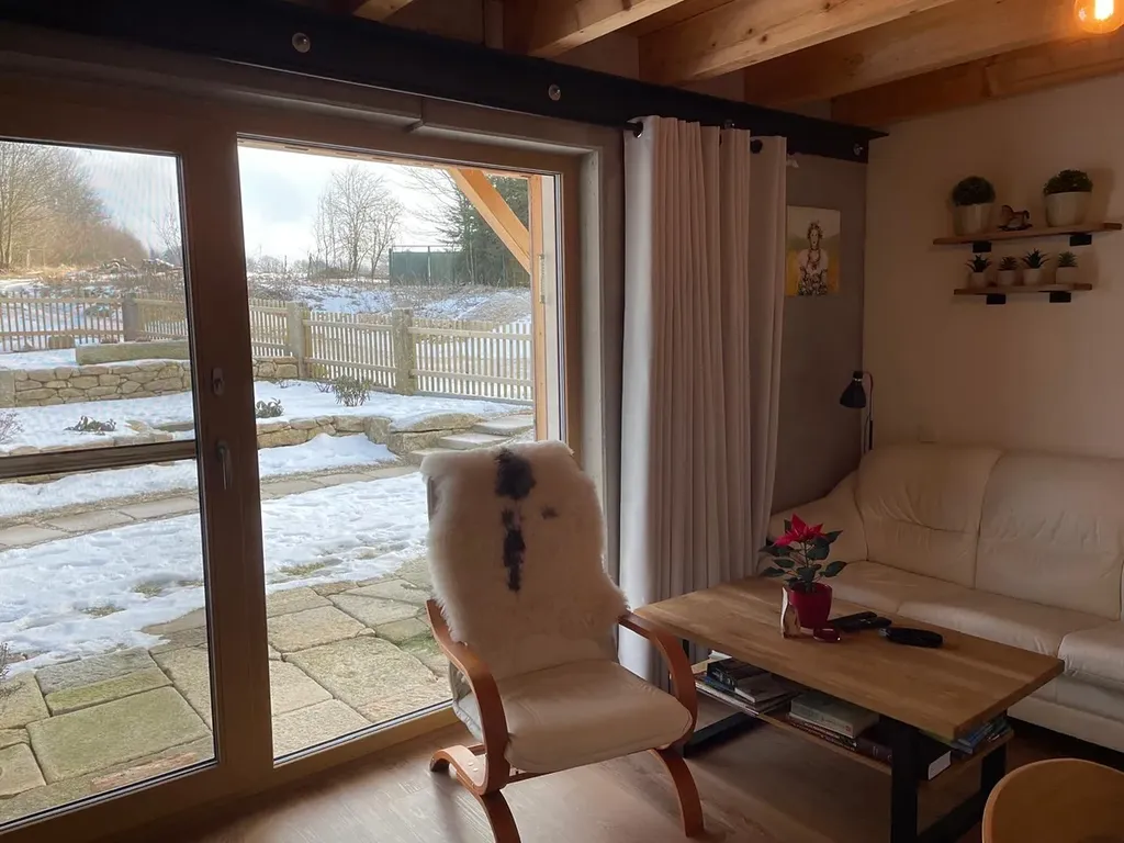 Technické provedení a vybavení. Podlahové vytápění v celém domě. Vytápění kvalitním elektrokotlem. Velkoformátová okna a dveře s izolačními trojskly. Podlaha vinyl a retro dlažba. Zateplená fasáda (polystyren 15 cm). Zdivo – vyzdívaný skelet Střecha z poctivých trámů (krokve, kleštiny) + kvalitní střešní tašky. Exteriér a příslušenství. Rozestavěná zděná garáž cca 70 m² – možnost dokončení dle vlastních představ. Zásuvka 380 V. Terasy a chodník z kamenných zápražáků. Zděný plot s kamennými sloupky a dřevěnými výplněmi. Tato nemovitost představuje výjimečnou kombinaci moderního bydlení, klidu a nádherné přírody. Ideální volba pro trvalé bydlení i rekreaci. Srdečně doporučuji osobní prohlídku. Bližší informace u makléře, prohlídky možné kdykoliv po předchozí telefonické dohodě.