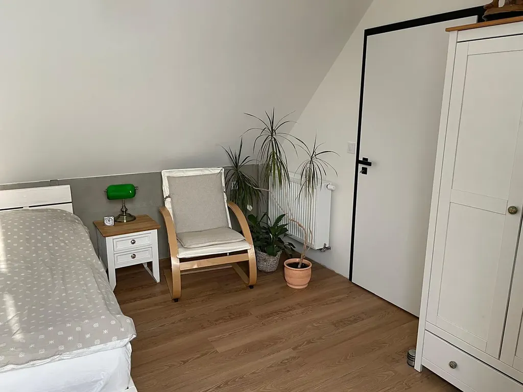 samostatný uzamykatelný vstup z terasy, vlastní koupelnu s toaletou. Tento prostor je ideální pro dvougenerační bydlení, pracovnu nebo pokoj pro hosty. V podkroví jsou: dva neprůchozí pokoje, z jednoho vstup na balkon s výhledem do volné krajiny a zahrady. Dvě koupelny se sprch. koutem a WC.