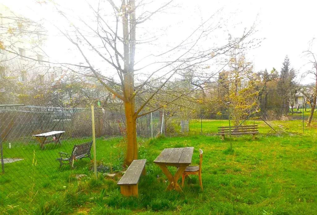 Dispoziční řešení bytu: vstupní chodba s velkou vestavěnou skříní, ze které se jde do koupelny (sprchový kout, umyvadlo, místo na pračku, el. žebřík, WC), ložnice, velká kuchyně, která navazuje na obývací pokoj. K bytu náleží sklep. Obývací pokoj i ložnice jsou orientovány na jihovýchod do zahrady za domem, kterou mohou obyvatelé domu využívat k posezení nebo odpočinku.