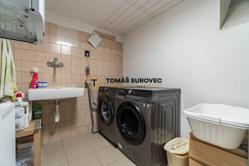 Vstupní chodba rozděluje hlavní obytný prostor – napravo se nachází kuchyně s přípojkou na myčku a vestavěnou mikrovlnkou, dále koupelna s vanou, samostatné WC a ložnice. Vlevo z chodby je vstup do obývacího pokoje, který je srdcem celého domu. Ze vstupní části vedou schody do suterénu, kde najdete technickou místnost s krbovými kamny, prádelnu, sklep a také praktický pracovní kout.