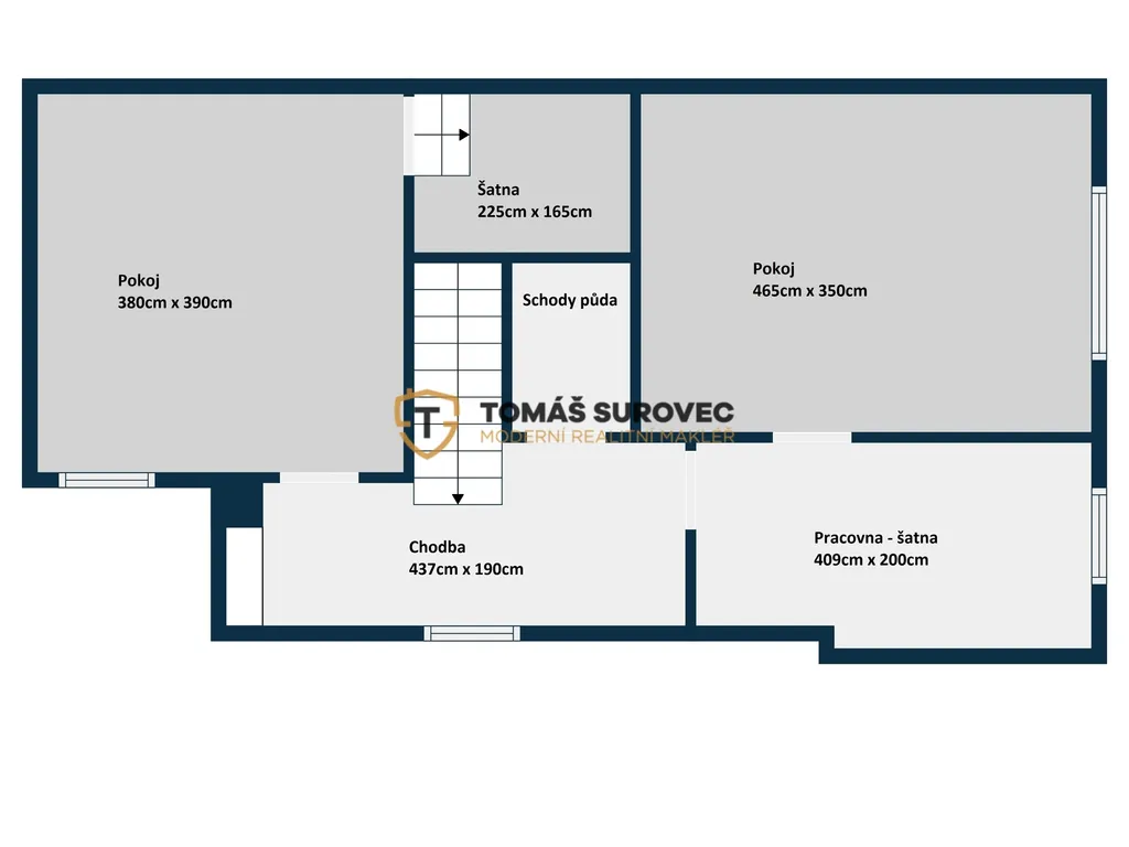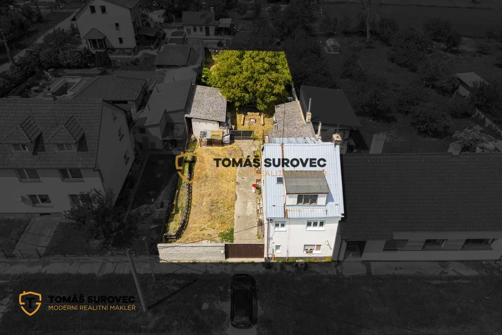 V patře najdete tři pokoje – jeden zrekonstruovaný se šatnou, druhý v původním stavu a třetí menší, ideální jako pracovna, dětský pokoj nebo úložný prostor. Dům je napojen na vodu, plyn i novou kanalizaci, vytápění zajišťuje plynový kotel.