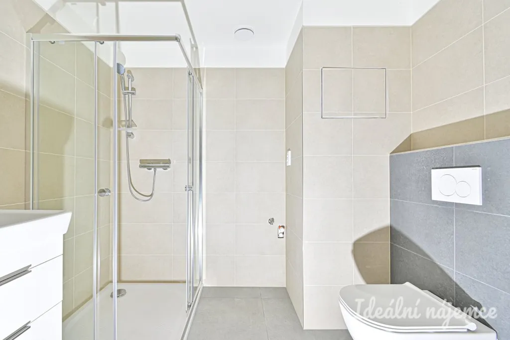 Koupelna je vybavena sprchovým koutem a umyvadlovou skříňkou s umyvadlem.