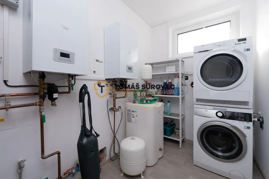 V přízemí se nachází velký obývací pokoj s kuchyní o rozloze 48 m², ložnice, další pokoj, koupelna, samostatné WC a technická místnost. V patře jsou tři neprůchozí pokoje, pracovna a prostorná hala, která může sloužit jako herna, studovna nebo odpočinková zóna. V přízemí je podlahové vytápění, v patře radiátory. Celková obytná plocha činí 235 m².