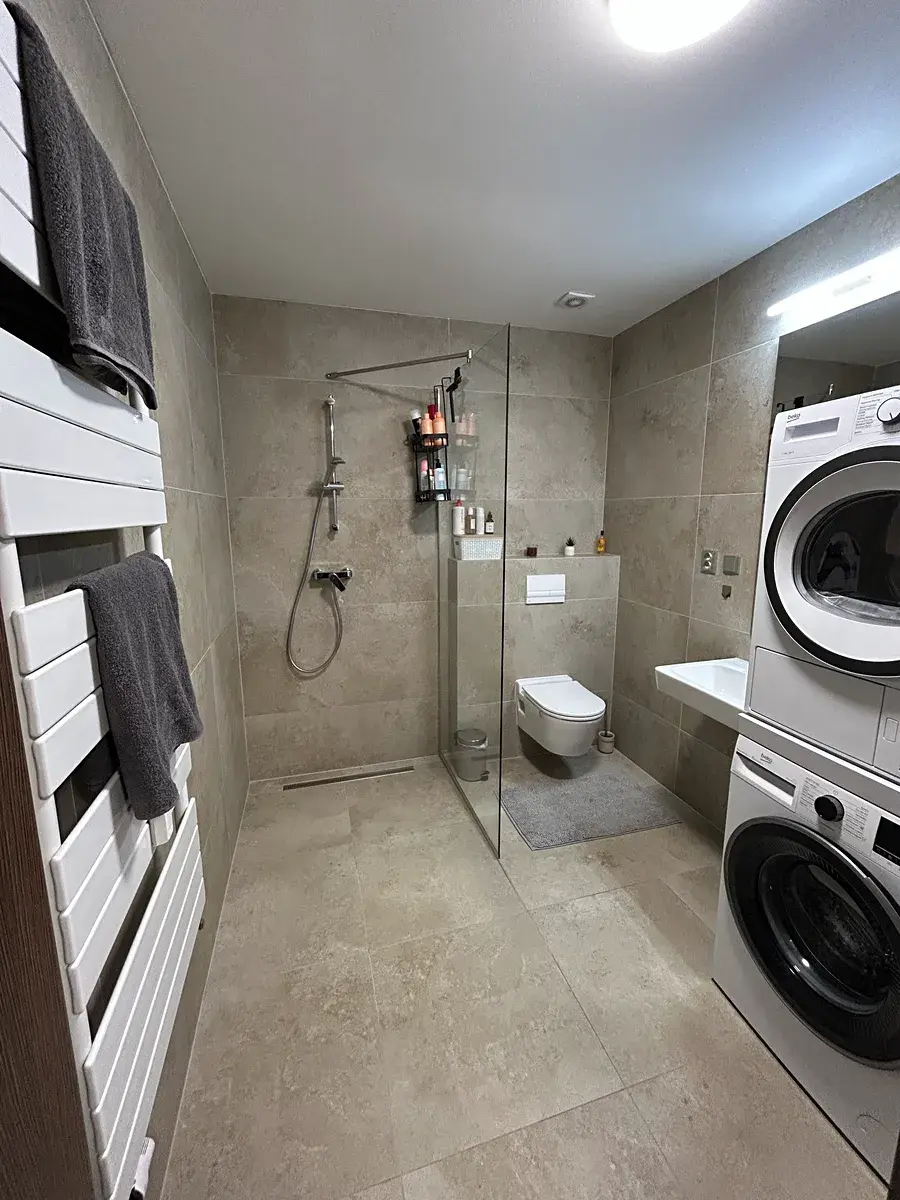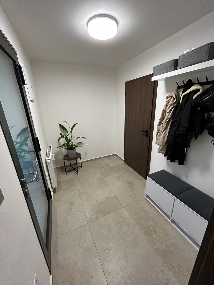 Dostatek úložného prostoru zajišťuje šatna s komodami a věšákem. Součástí je moderní kuchyňská linka vybavená kombinovanou lednicí, mikrovlnnou troubou, el. troubou, digestoří a indukční varnou deskou. Koupelna má velký sprchový kout.