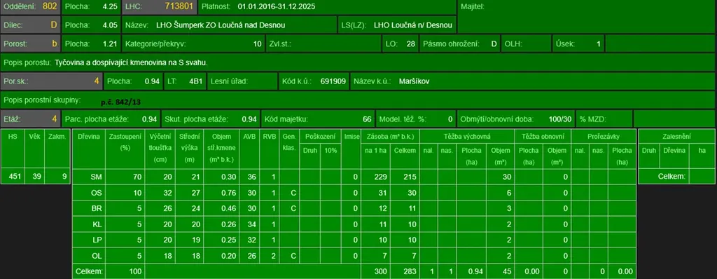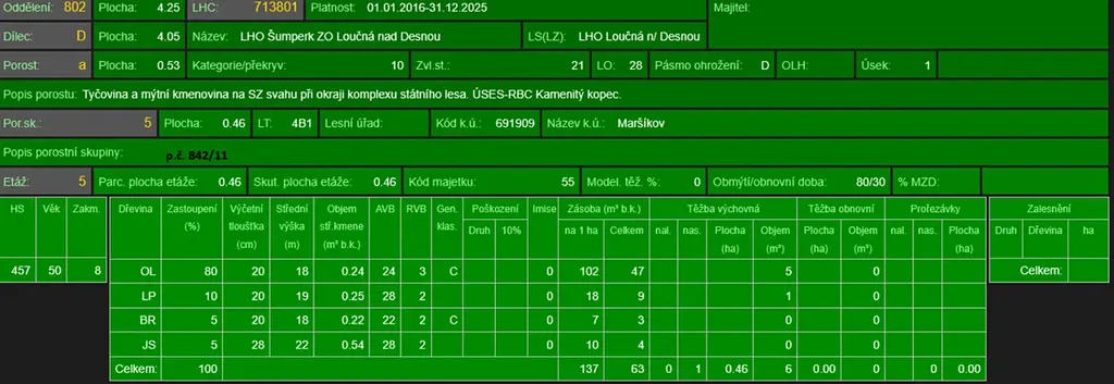 - p.č. 842/11 vedená jako lesní pozemek o celkové výměře 5 282 m2 (stáří lesa 126 let - zastoupení dřevin lípa, smrk, bříza, stáří lesa 60 let - zastoupení dřevin olše, lípa, bříza, jasan),