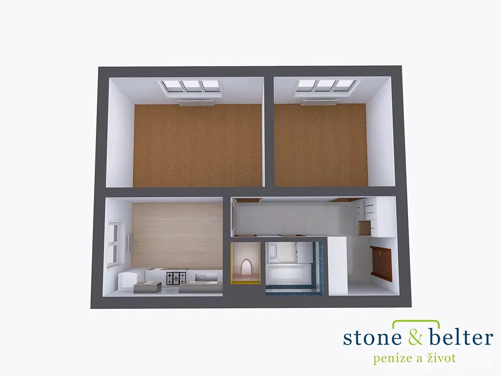 Okno kuchyně je situováno na jih. Dva samostatné pokoje mají velká okna orientovaná na západ. Tím je zajištěn dostatek světla po celý den. K bytu patří nadstandardně prostorný sklep o rozměrech 4 m².