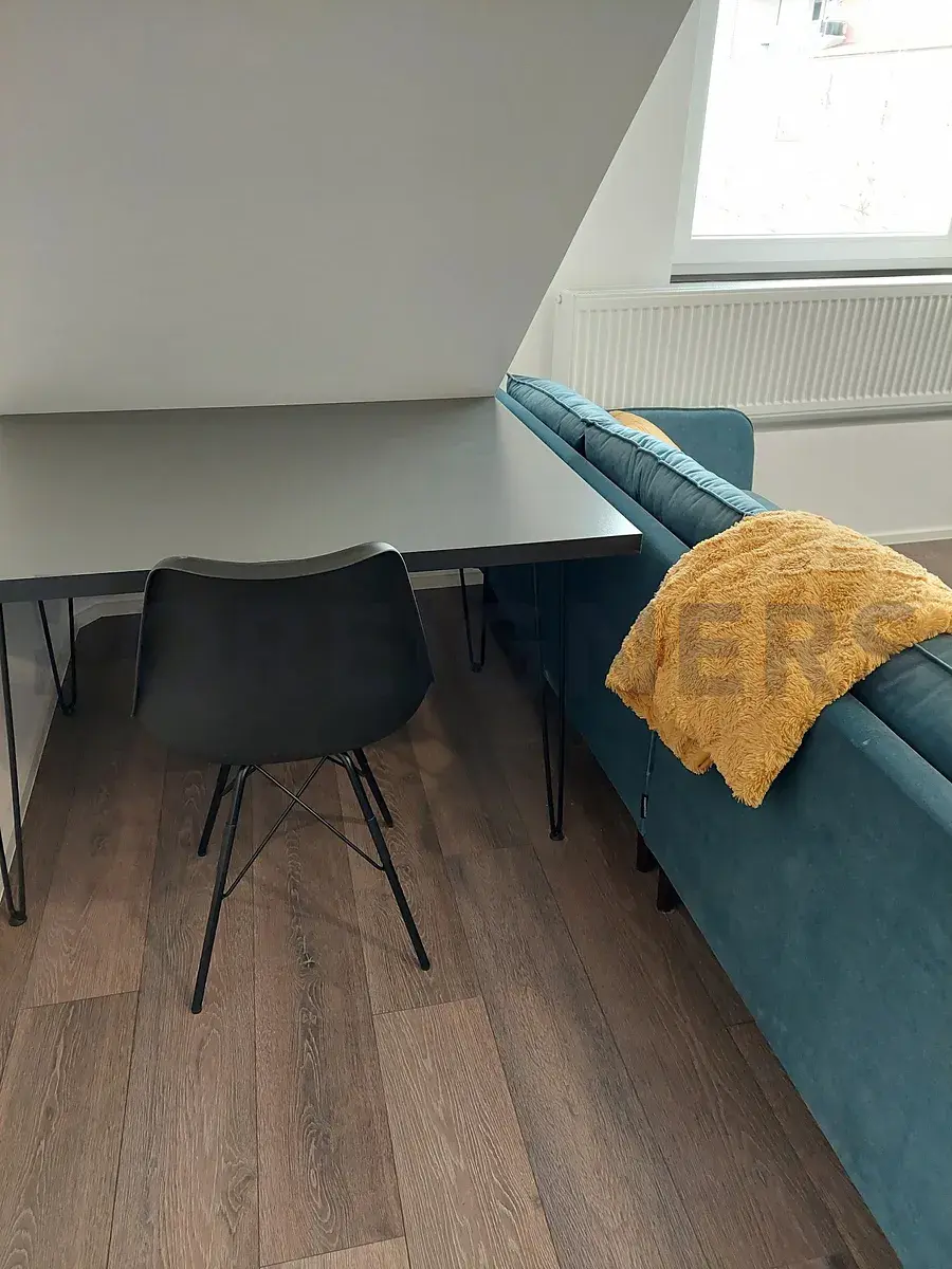 Kuchyň s kuchyňskou linkou, indukční deskou s troubou, ledničkou, mrazákem, mikrovlnnou troubou, digestoří, barem, jídelním stolem se 4 židlemi. Obývací pokoj se sedačkou, konferenčním stolem, PC stolem a TV stolkem.