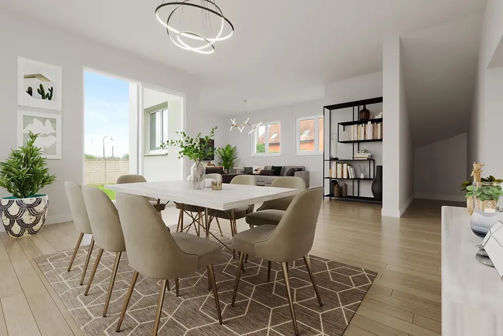 V přízemí domu se kromě technické místnosti a samostatné toalety nachází srdce domova, obývací pokoj (46 m) propojený s jídelnou. Dále se v přízemí nachází kuchyňský kout (11,3 m). Možnost vzhledu kuchyňské linky je na přiložené vizualizaci. Vstup na terasu tvoří francouzské okno, které se nachází v jídelní části domu. V prvním nadzemním podlaží je projektována ložnice (21,1 m), dva dětské pokoje (15,5 a 16 m), koupelna (8,6 m) a samostatné WC.