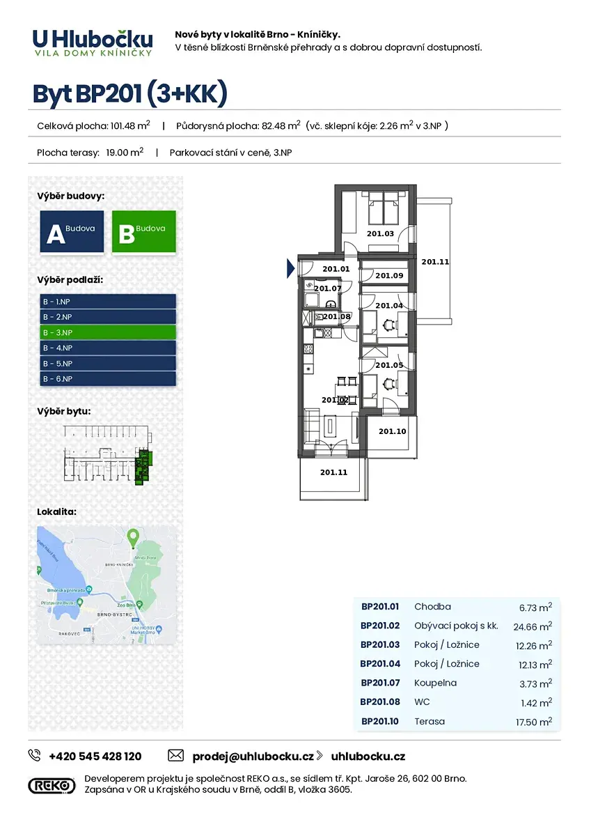 Nabízíme k prodeji byt o dispozici 4+kk s celkovou podlahovou plochou 80,22 m², který disponuje šatnou a třemi terasami o celkové výměře 29,13 m². Byt se nachází v 3.NP moderního terasového viladomu s výtahem v projektu U Hlubočku, dům B, v atraktivní lokalitě Brno–Kníničky. Orientace bytu je na SV s krásným výhledem na Mniší horu. Kupní cena zahrnuje parkovací stání v domě.