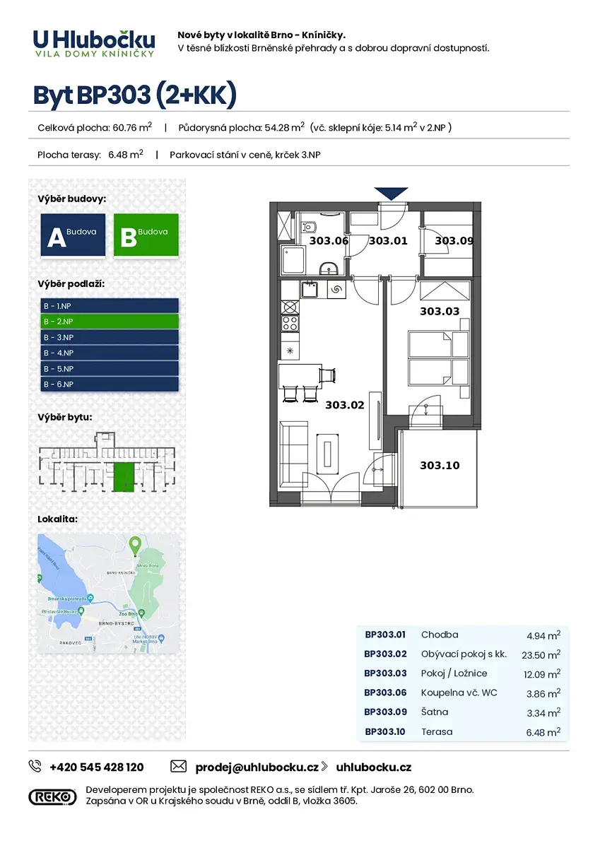 Nabízíme k prodeji byt o dispozici 2+kk s celkovou podlahovou plochou 49,14 m², který disponuje šatnou a jednou terasou o celkové výměře 6,48 m². Byt se nachází v 2.NP moderního terasového viladomu s výtahem v projektu U Hlubočku, dům B, v atraktivní lokalitě Brno–Kníničky. Orientace bytu je na východ s krásným výhledem na Mniší horu. V případě zájmu lze dokoupit parkovací stání.
