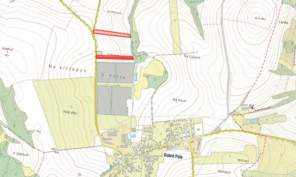 V katastrálním území Dobré Pole u Vitic, okres Kolín, nabízíme k prodeji zemědělské pozemky zapsané na LV č. 857 a 921. Celková výměra těchto pozemků činí 14 401 m², předmětem prodeje je z toho 12 344 m² orné půdy.