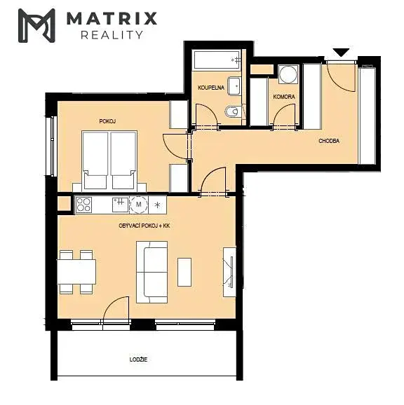 Dispozici bytu tvoří prostorná chodba, obytná část s kuchyňskou linkou, ložnice, koupelna se záchodem a komora s přípravou na napojení pračky. Lodžie je orientována jižním směrem a poskytuje dostatečné soukromí pro relaxaci a odpočinek.