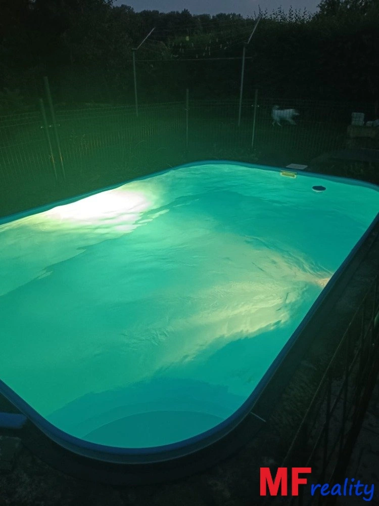 K příjemnému užívaní relaxace i odpočinku, slouží zapuštěný bazén s ohřevem tepelným čerpadlem s příjemným posezení u kamenného grilu.