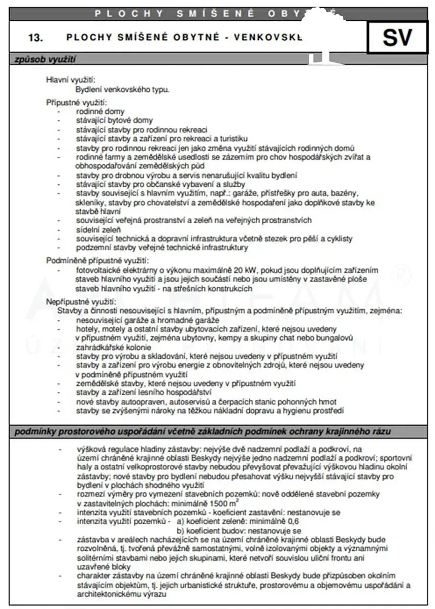 Možnosti výstavby: koeficient zastavěnosti 40 %, výšková regulace: max. 2 nadzemní podlaží + podkroví