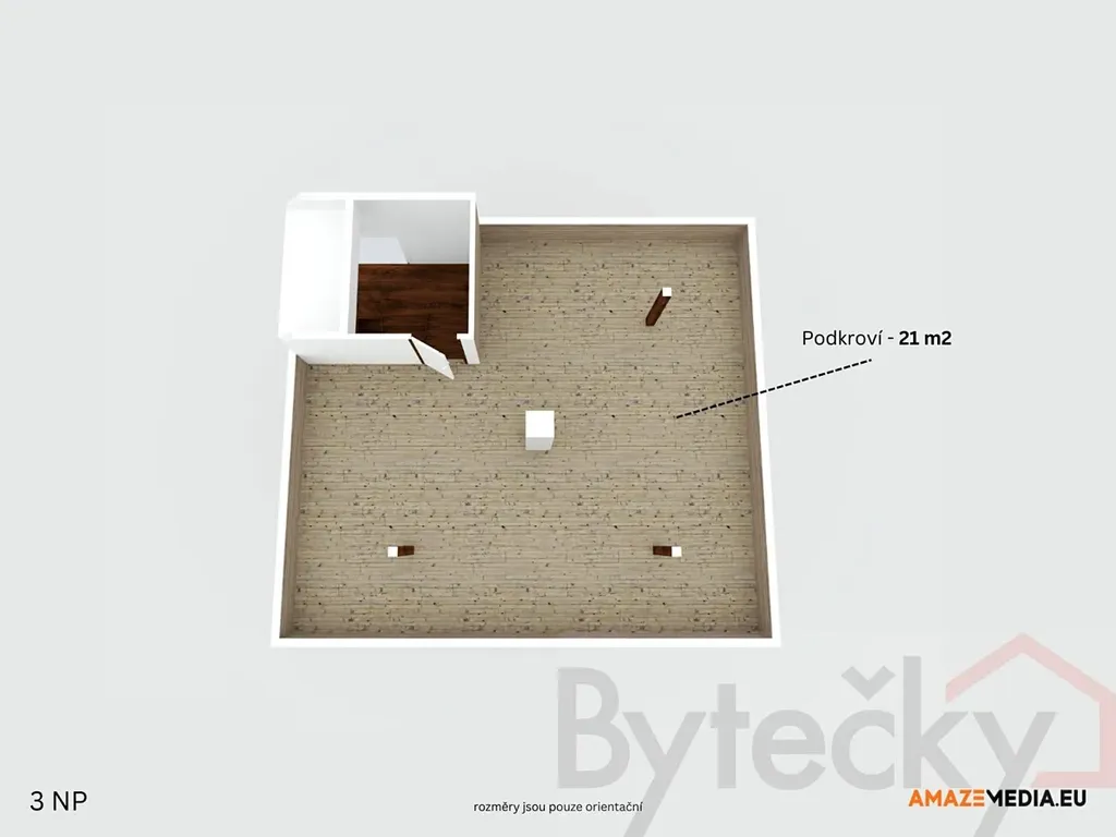 2NP (patro): kuchyň, WC, chodba, koupelna s vanou, 3 pokoje, schodiště na půdu 80 m