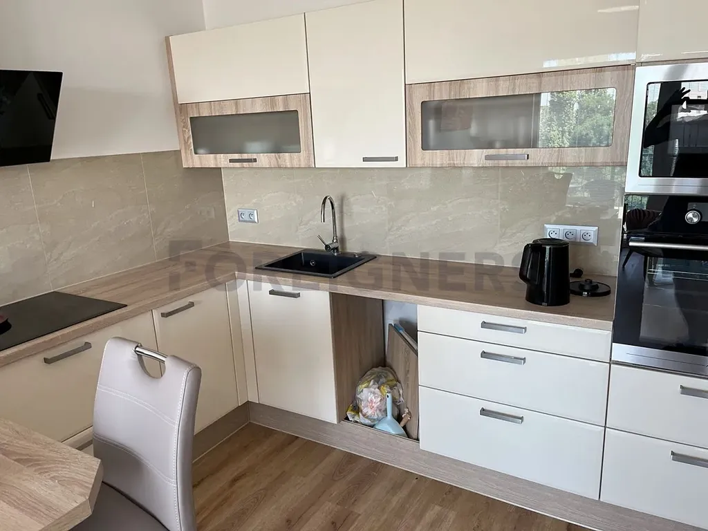 Byt o velikosti 54 m2 je nabízen jako plně zařízený a připravený k okamžitému nastěhování. Dominantou je prostorný obývací pokoj s kuchyňským koutem. Kuchyňská linka je zařízena vestavěnou lednicí s mrazákem, indukční varnou deskou, elektrickou troubou a mikrovlnnou troubou. K dispozici je také jídelní stůl se 4 židlemi.