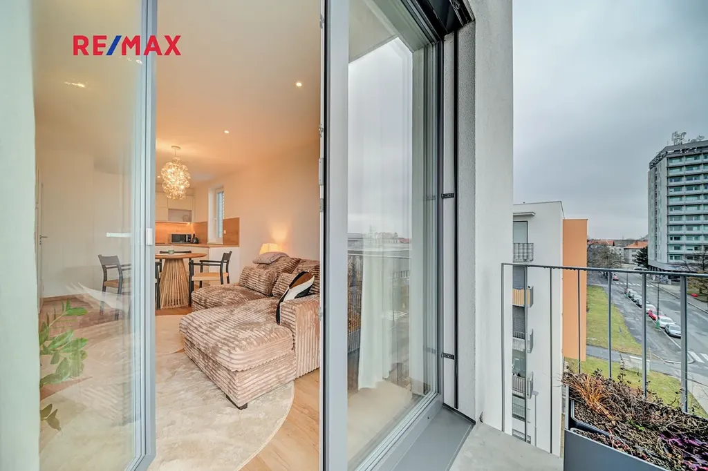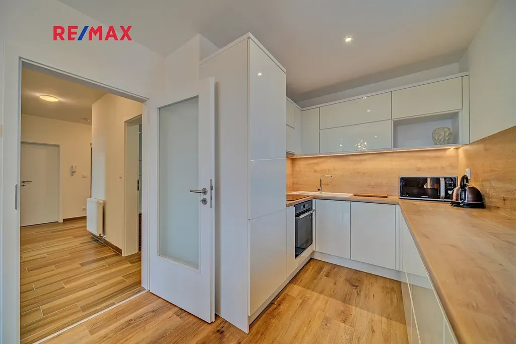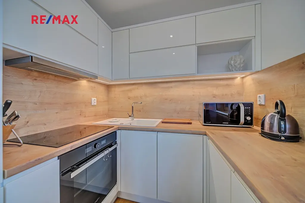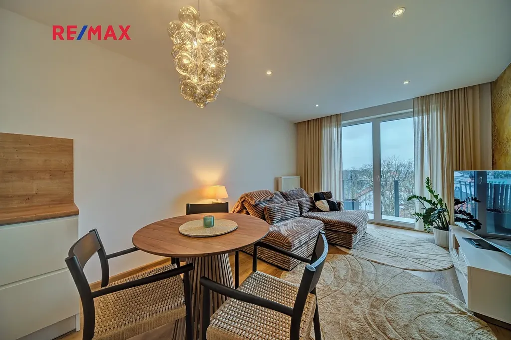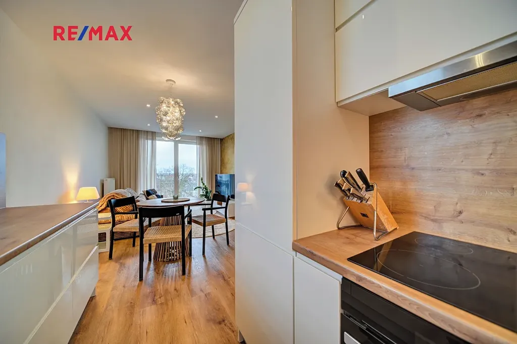 Dominantou bytu je světlý obývací pokoj s kuchyňským koutem o velikosti 21,48 m², kde je pro maximální tepelný komfort instalována termoizolace v podhledech, která přispívá k příjemnému klimatu po celý rok. Kuchyň je vybavena kvalitní kuchyňskou linkou s vestavěnými spotřebiči a drtičkou bioodpadu, což podtrhuje praktický a moderní charakter bydlení.
