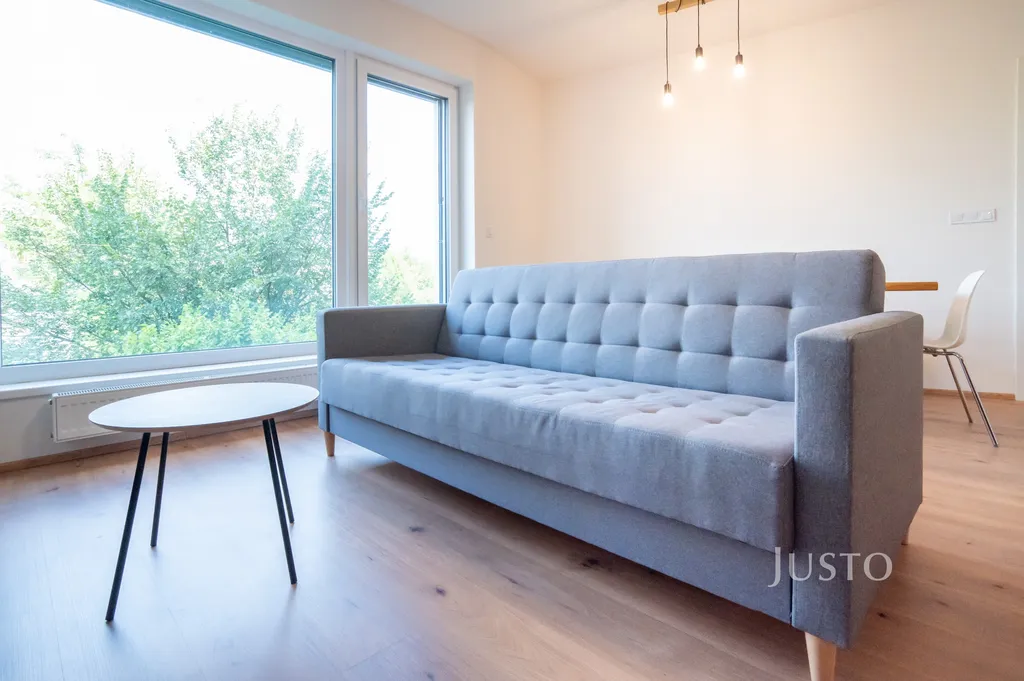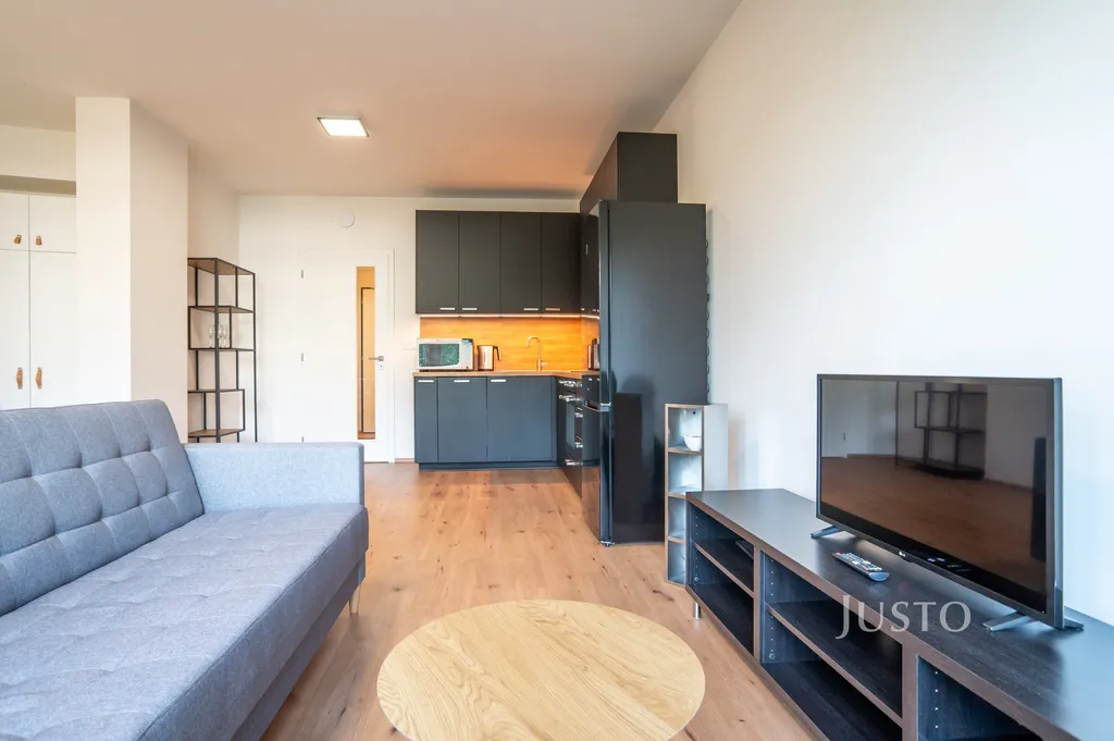 Byt je kompletně vybaven nábytkem a spotřebiči – moderní kuchyňská linka s indukční varnou deskou, myčkou, inteligentní mikrovlnnou troubou, pohodlná sedačka, televize. Po dohodě je možné doplnit další úložné prostory nebo vytvořit pracovní kout v ložnici.