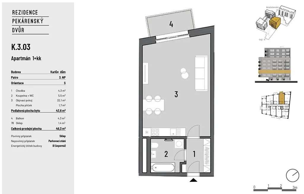 Bydlení, které není jen o čtyřech stěnách. Tento moderní ateliér 1+kk se nachází ve 3. NP v projektu Pekárenský dvůr, konkrétně v Karlově domě, na adrese Bratislavská 80 v Brně. Místě, kde se spojuje městský život, klid uzavřeného vnitrobloku a nadstandardní služby, které v běžném bydlení nenajdeš.