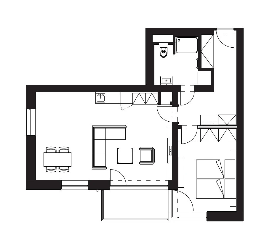 • prostorný obývací pokoj o velikosti cca 30 m² s velkými okny a kuchyňským koutem