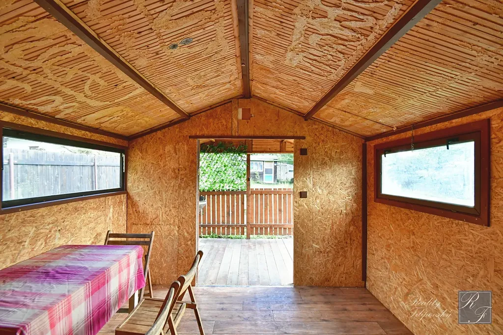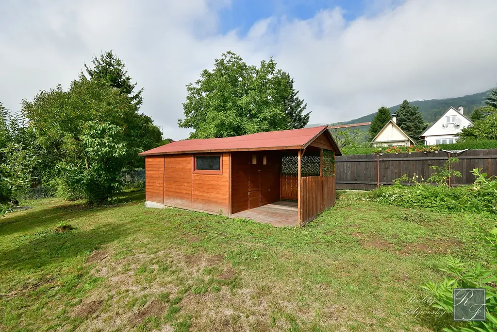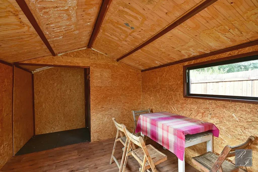 Na zahradě aktuálně stojí stavba bez č. p. i č. ev, zapsaná v katastru nemovitostí, se zastavěnou plochou 11 m2. Ta je využívána jako sklad zahradního náčiní. Dále se zde nachází dočasná stavba sloužící jako odpočinkové zázemí k zahradě s podlahovou plochu hlavní místnosti 13,6 m2 a verandou o výměře 6 m2. Tento objekt je v celkově velmi dobrém stavu a je opatřen i základním zateplením obvodového pláště.