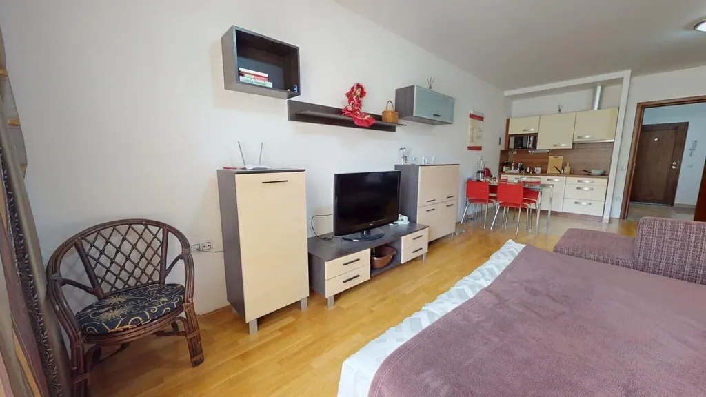 Dálkové topení. Byt se skládá z předsíně, obývacího pokoje s kuchyňským koutem, koupelny se sprchovým koutem a WC.