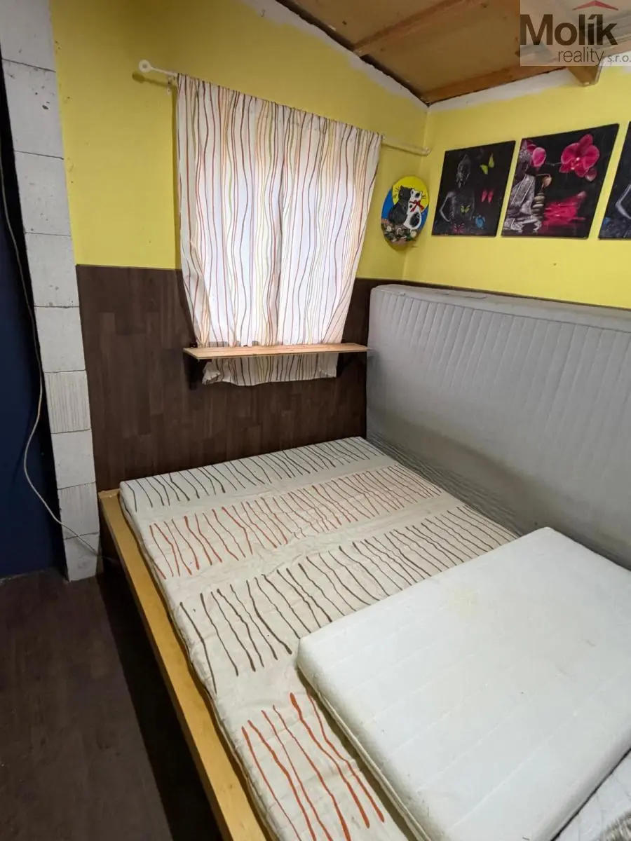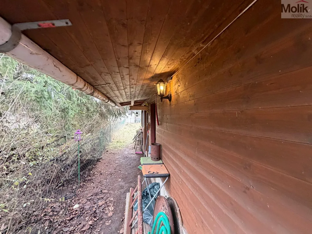 Součástí pozemku je podezděná chatka se zavedenou elektřinou, která nabízí obytnou místnost vybavenou kuchyňským koutem, krbovými kamny a postelí. Na stavbu navazuje praktická pergola pod společnou novou střechou.
