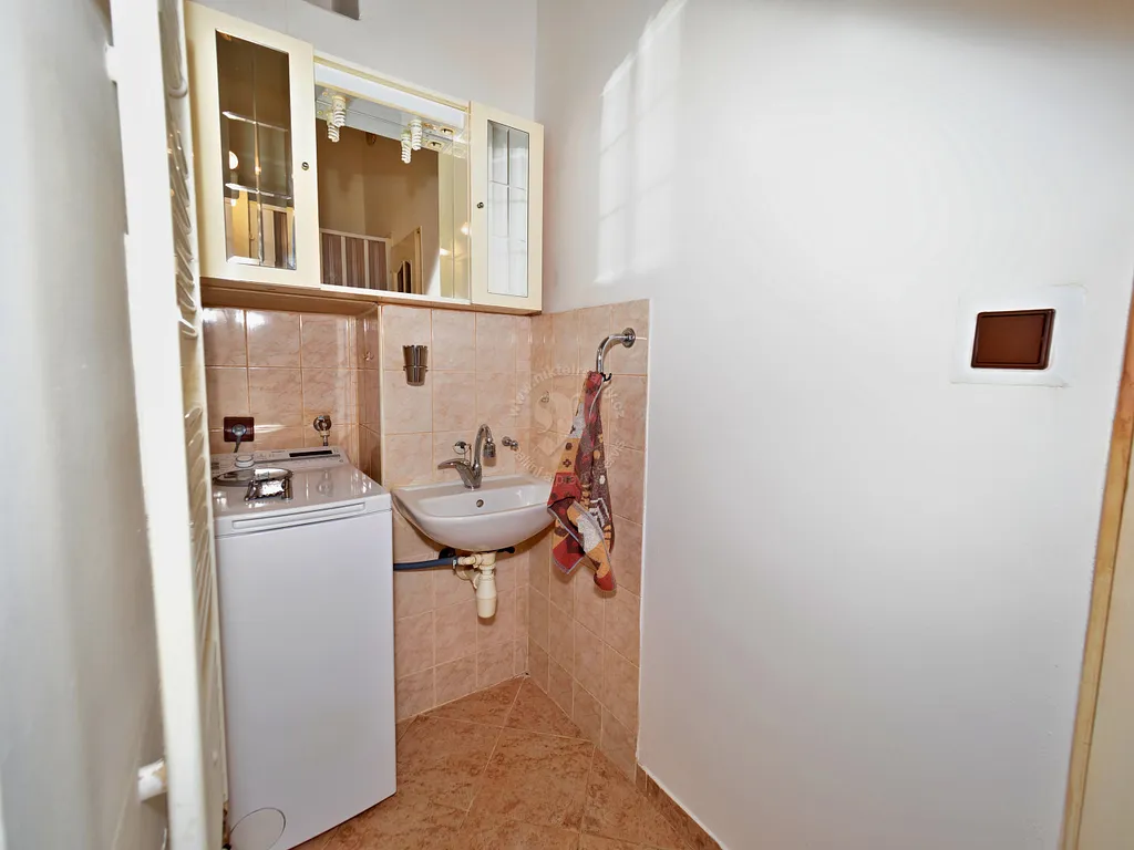 Z kuchyňského koutu je rovněž vstup do koupelny (3,1 m²) s instalovaným prostorným sprchovým koutem, umyvadlem se spodní skříňkou a místem na pračku, včetně přípojek pro ní. Vše realizováno ve světlém, béžovém keramickém obkladu, na zemi položena keramická dlažba. Dále na koupelnu navazuje toaleta (1,1 m²).