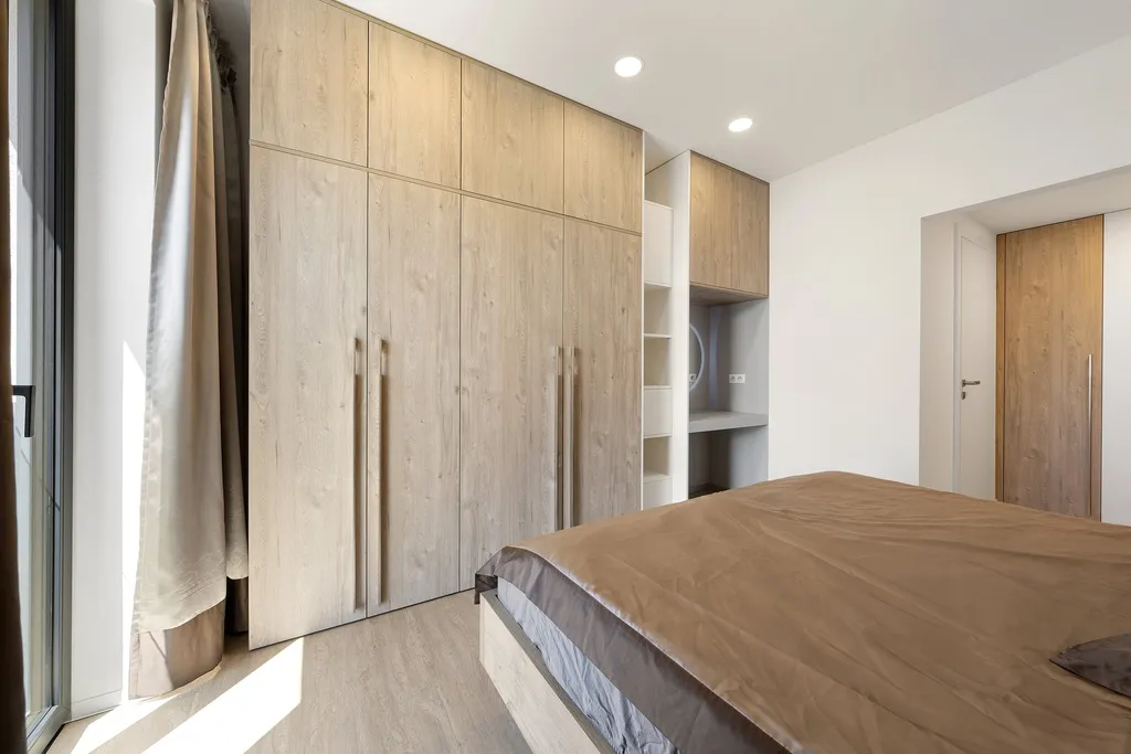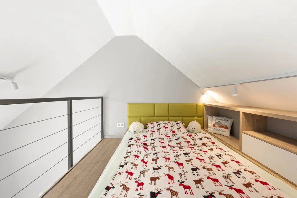 V patře najdete tři ložnice – hlavní ložnice má vlastní koupelnu se sprchovým koutem a toaletou a prostornou šatnu, dva dětské pokoje jsou vybaveny chytrými vestavnými patry, která šetří místo a přinášejí další hrací i úložný prostor. K dispozici je zde také druhá koupelna s vanou a samostatné WC.