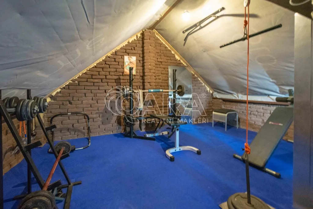 K jednotce patří vlastní dvůr o velikosti 123 m2 a oplocená zahrada o velikosti 360 m2. Dále garáž s dílnou, zastřešenou terasou s krbem a tělocvičnou v patře nad garáží o celkové velikosti 67,8 m2. Na vlastní zahradě altán, skleník a zapuštěný bazén.