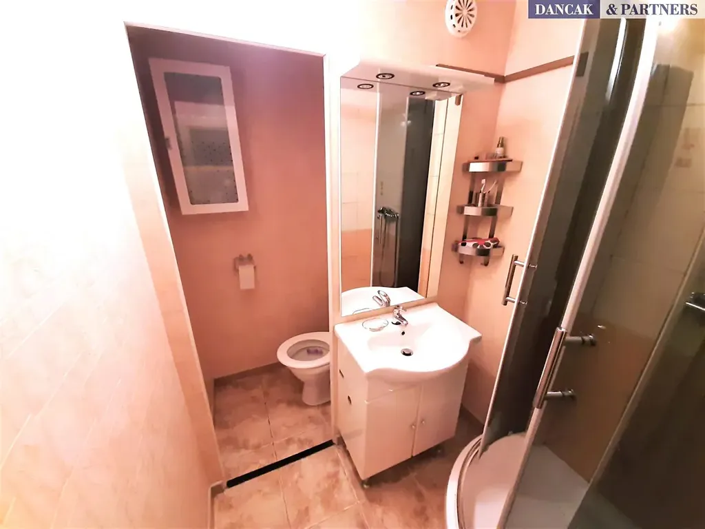 Kuchyň je vybavena rohovou kuchyňskou linkou s vestavěnou troubou, pračkou, mikrovlnkou, novou sklokeramickou varnou deskou, lednicí s mrazákem a barovým pultem. . V koupelně sprchový kout, umyvadlo, keramické obklady a toaleta. Plastová okna s novými žaluziemi, podlahy PVC krytina.