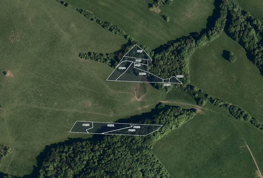 Pozemky jsou uspořádány do dvou kompaktních celků – každý tvořen kombinací louky a přilehlého lesního porostu. Díky tomuto přirozenému propojení vznikají ucelené části krajiny vhodné k hospodaření i zachování přírodního charakteru území.