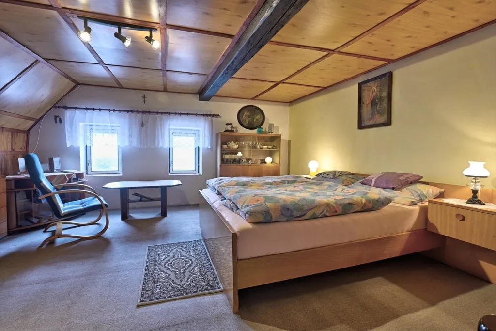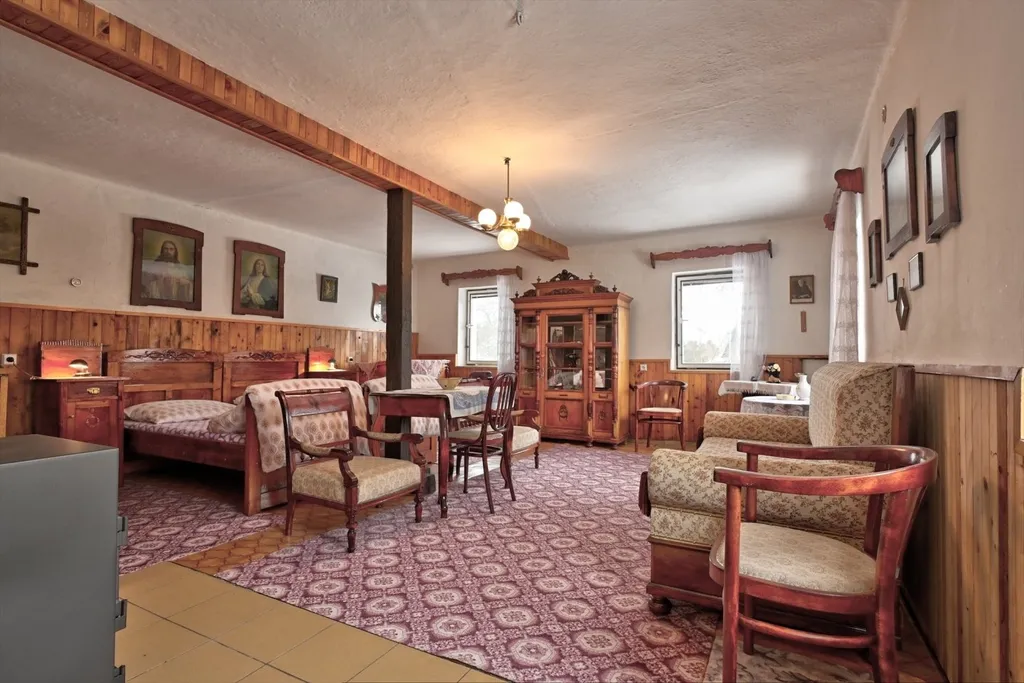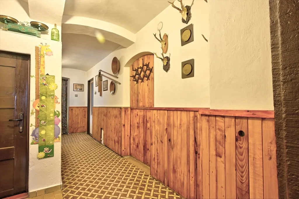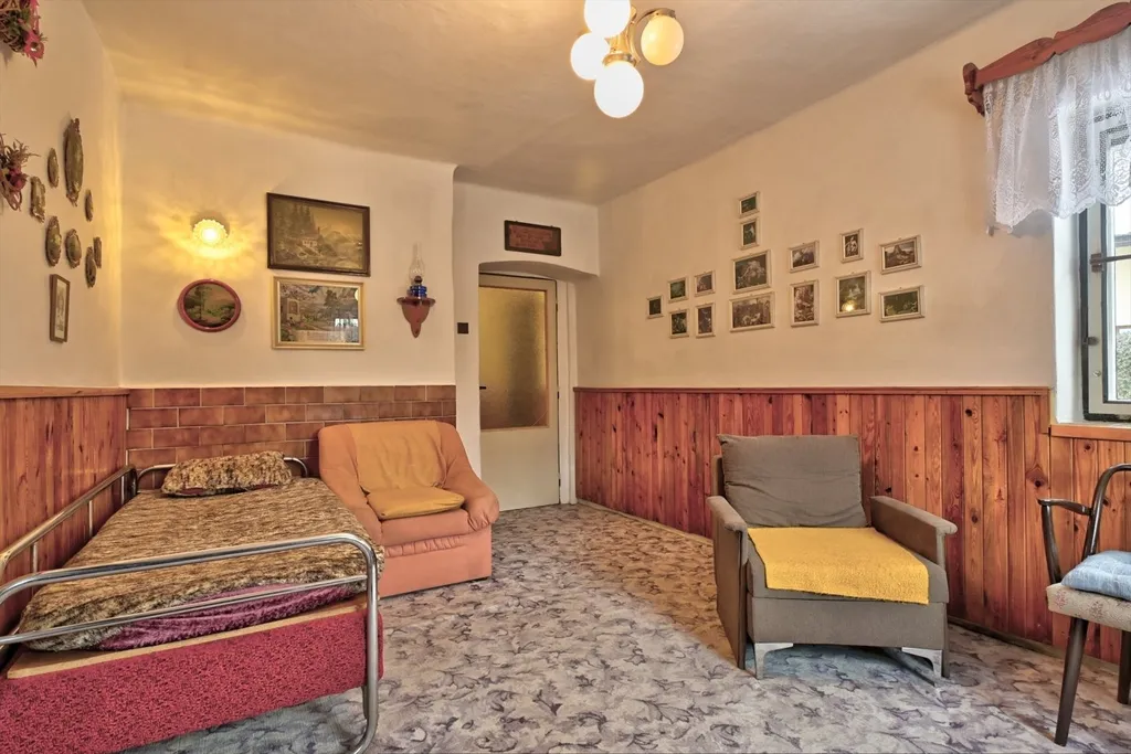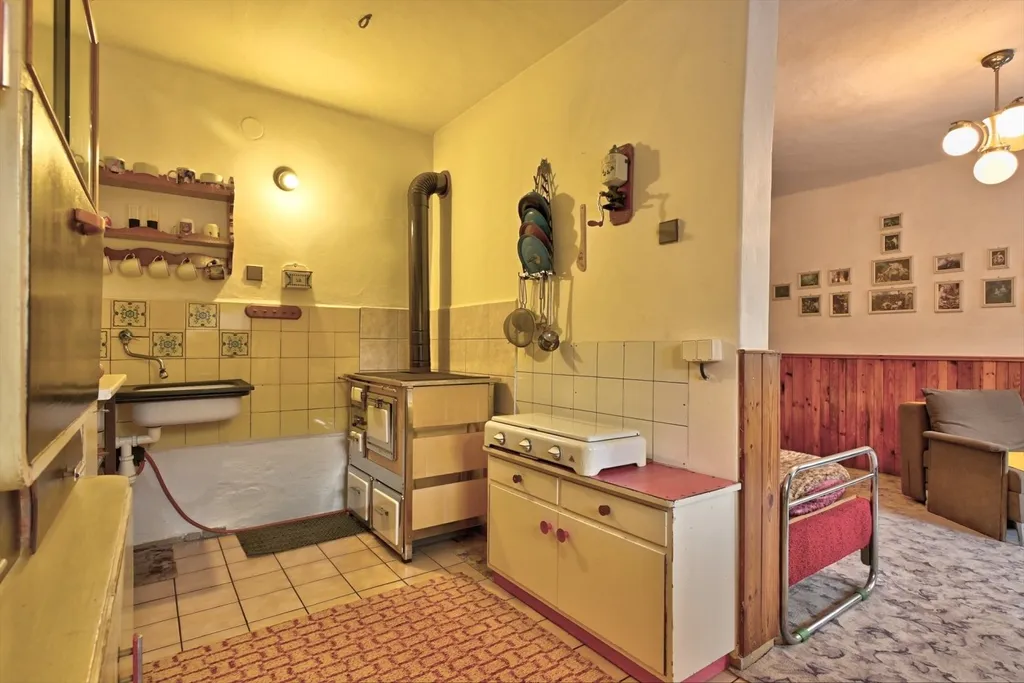 Nabízíme rodinný dům v obci Dolní Kalná v části Slemeno. Zděný dům s původními prvky obytné a hospodářské části má zachované klenuté stropy a kamenná ostění. V podkroví je jedna obytná místnost a rozsáhlé prostory pro úpravy a využití dle představ nového vlastníka. V přízemí je prostorná ložnice a obývací pokoj s částečně oddělenou kuchyní. Na konci chodby je vstup do spižírny, do koupelny s odděleným WC a do malého sklepa. K obytnému domu navazuje garáž s dílnou a zastřešením pro dřevo. Dům je obklopený rovinatým pozemkem. Je napojen na vodovodní řád a septik. Vytápění je zajištěno lokálními kamny či elektrickými přímotopy, ohřev vody elektrickým bojlerem. Momentálně je využívaný pro rekreaci. Obchody a služby se nachází v nedalekém Hostinném 5 km a Vrchlabí vzdáleném 15 km.