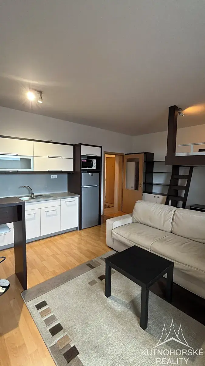 Obývací pokoj s kuchyňským koutem a vstupem na balkon + dřevěné patro na spaní.