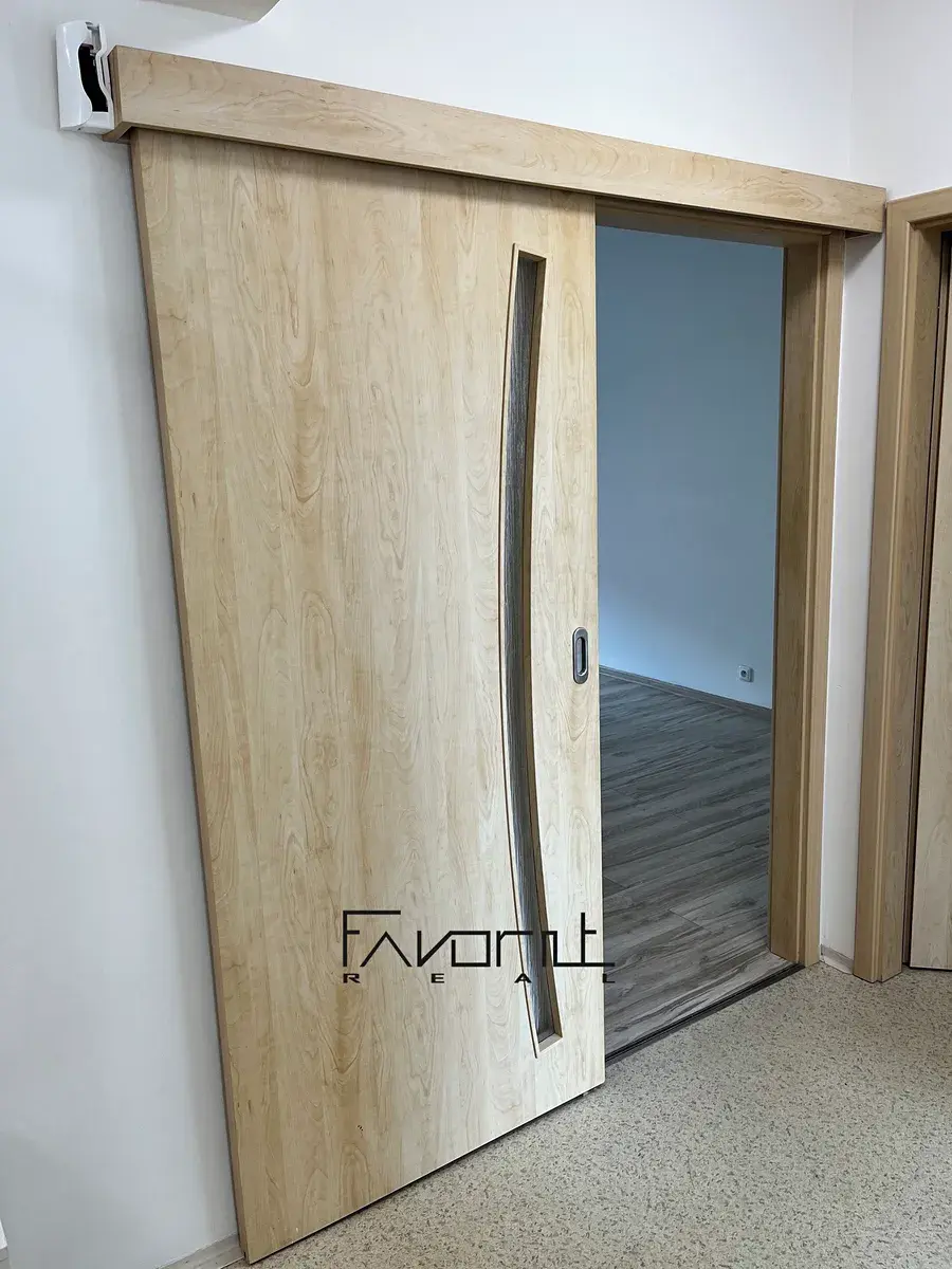 Laminátová plovoucí podlaha ve světlém dekoru dřeva, posuvné dveře ve světlé dýze kombinované se sklem, stropní svítidlo.