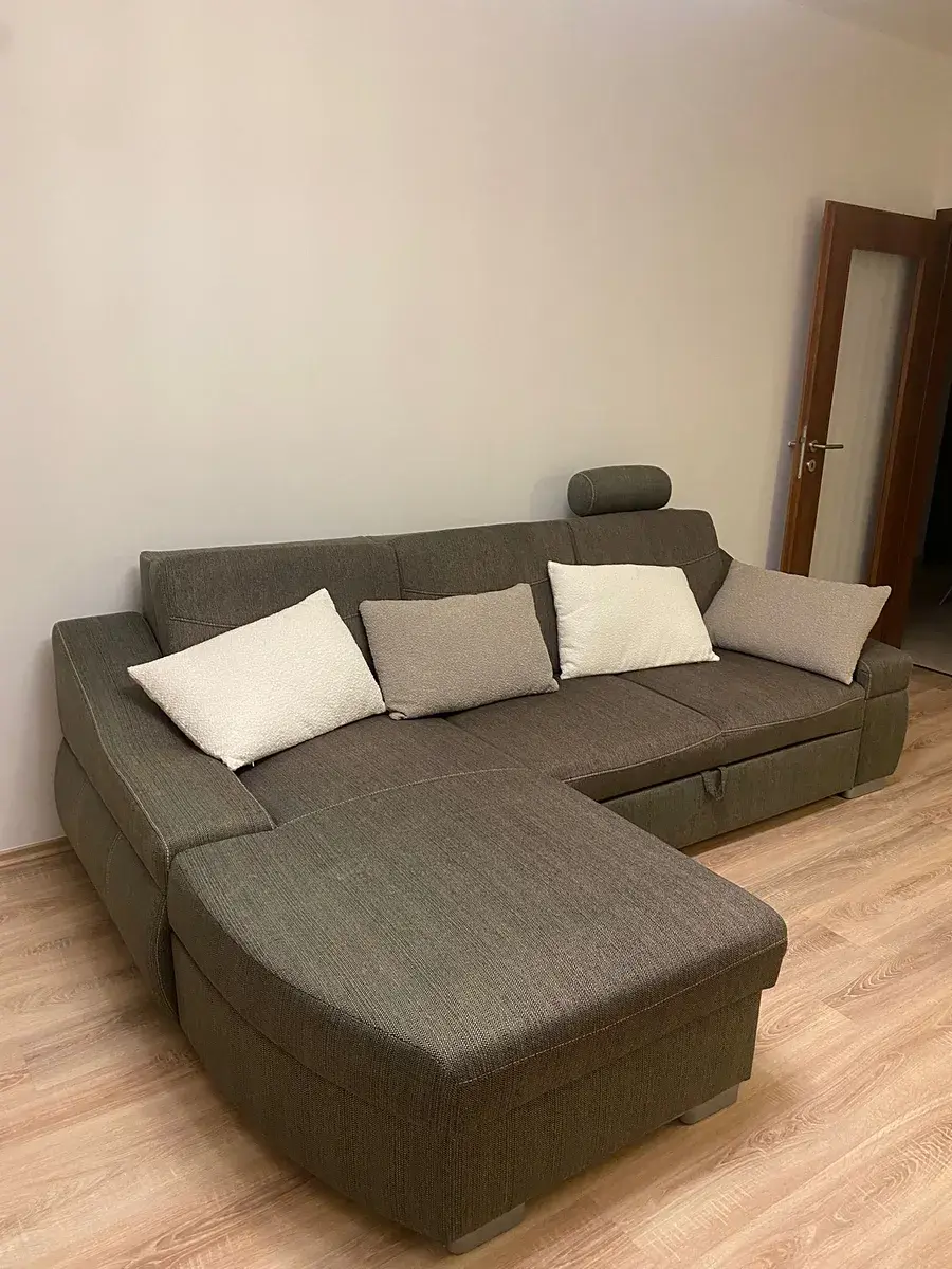 Dispozice bytu zahrnuje vstupní předsíň s velkými vestavěnými skříněmi, koupelnu s vanou a pračkou, samostatnou toaletu a obývací pokoj propojený s kuchyňským koutem. Kuchyně je plně vybavena kvalitními spotřebiči i nádobím. Obývací pokoj i ložnice jsou kompletně zařízené nábytkem. Byt je orientován na západ, díky čemuž je světlý a příjemný po celý den.