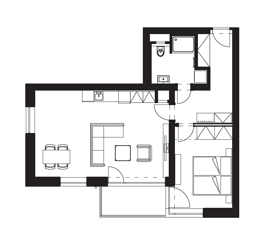• prostorný obývací prostor přes 30 m² s celoproskleným oknem až k podlaze orientovaným na jih – spousta denního světla zaručena