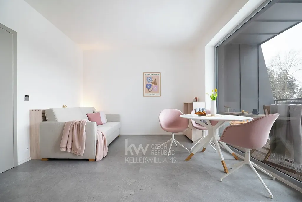 Velké francouzské okno dává prostoru světlo, vzdušnost a pocit otevřenosti. Zároveň je apartmán situován tak, že nikdo z okolí nemá možnost nahlížet dovnitř – kombinace otevřeného horizontu a skutečného soukromí je zde výjimečná.