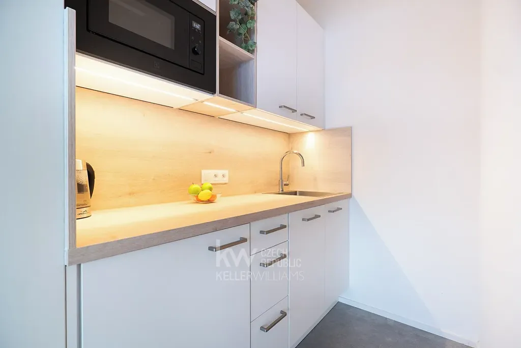 Kuchyňská linka je vybavena myčkou, lednicí, mikrovlnnou troubou a vařičem.