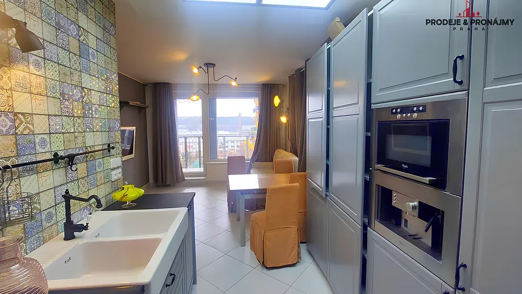 Objemná kuchyň je vybavena technikou Whirlpool: trouba, mikrovlnka, kávovar, myčka. Lednička Electrolux. Dvojitý dřez a umyvadlo Laufen, baterie Grohe.